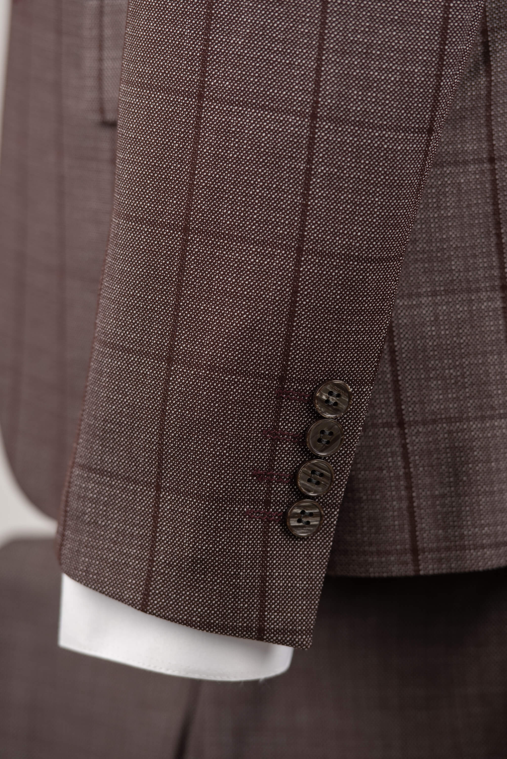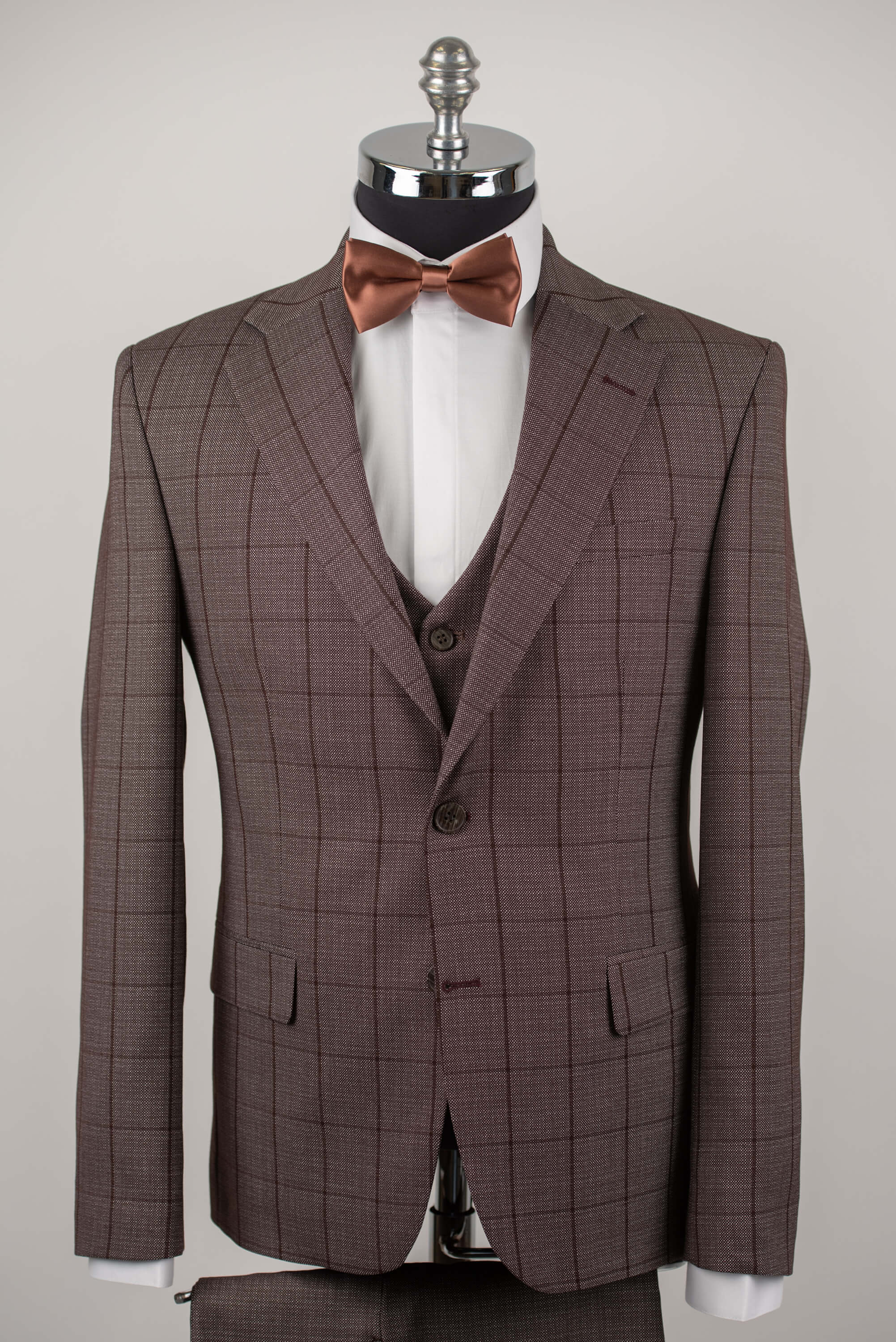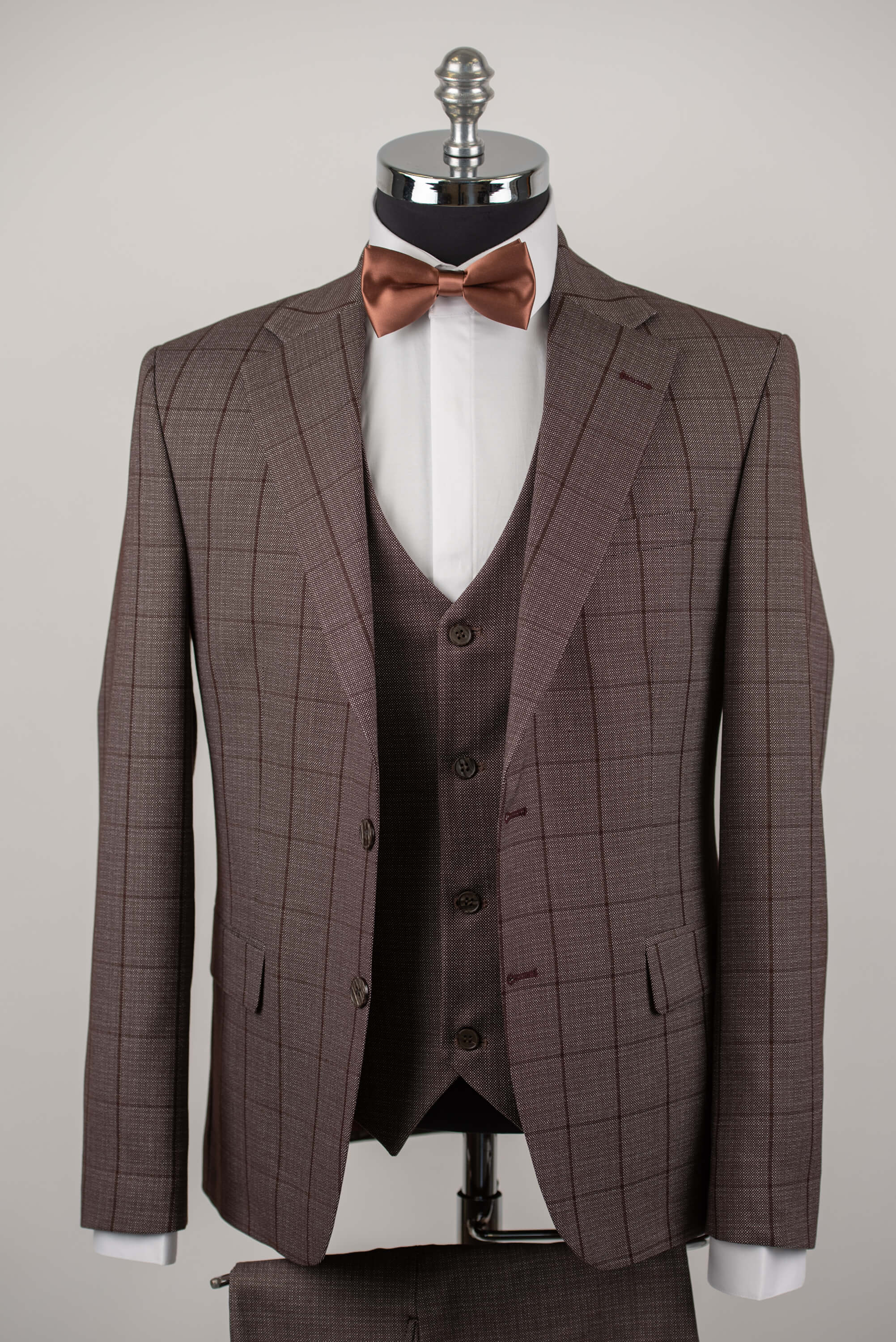 Brūns Azzaro slim fit uzvalks ar vesti un rūtainu rakstu