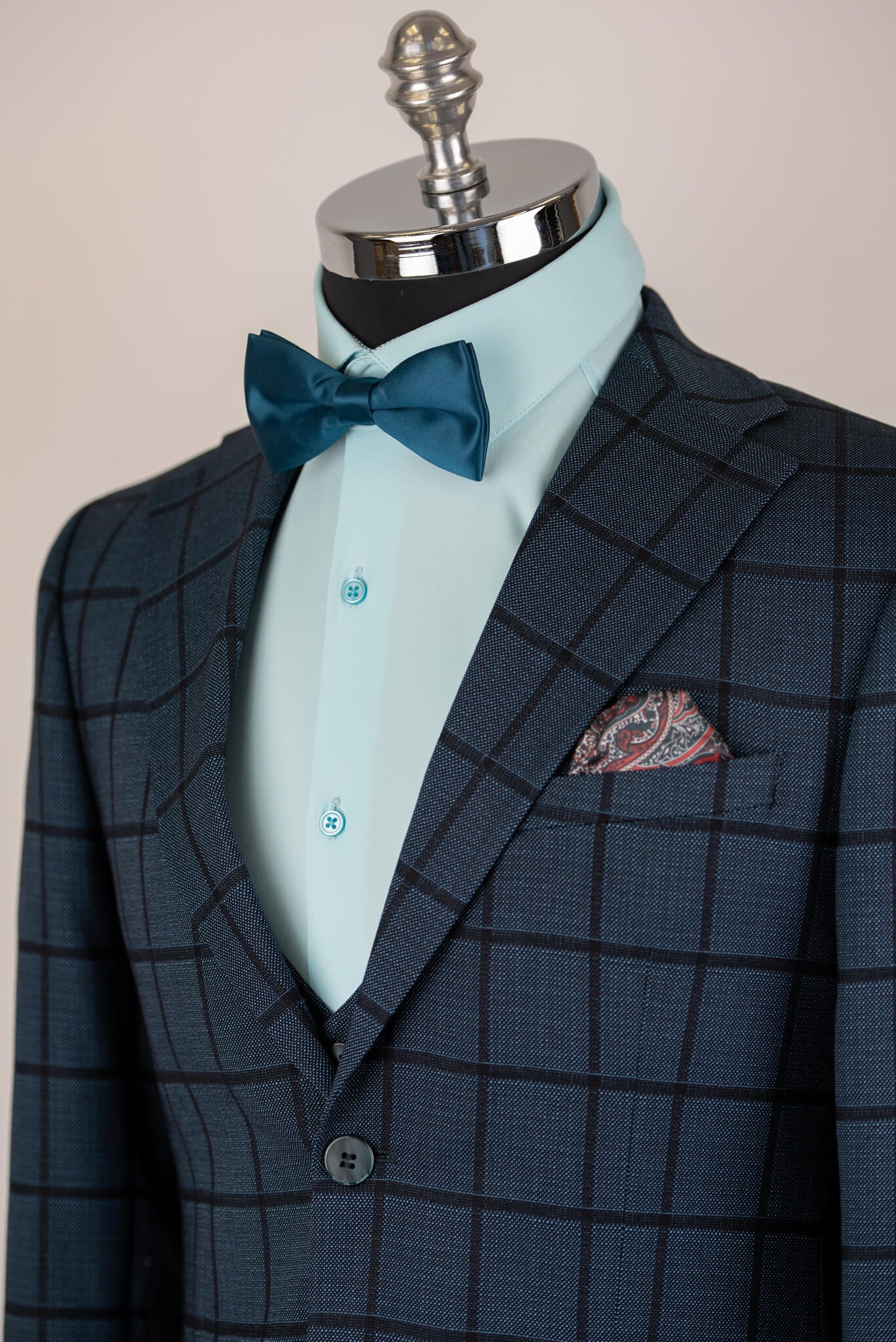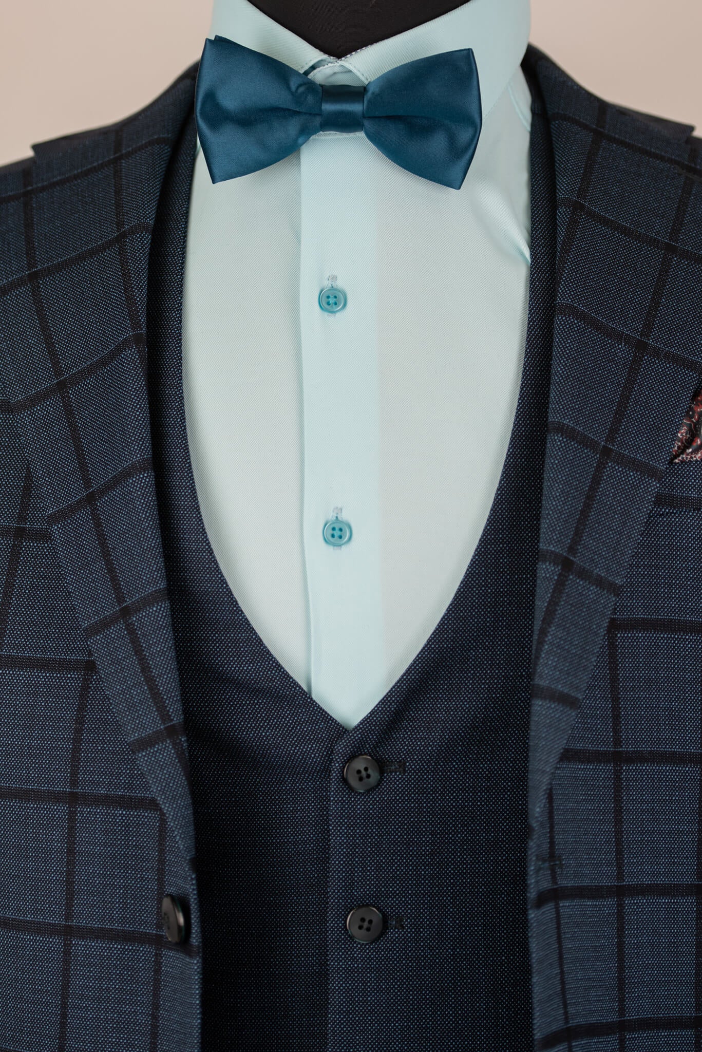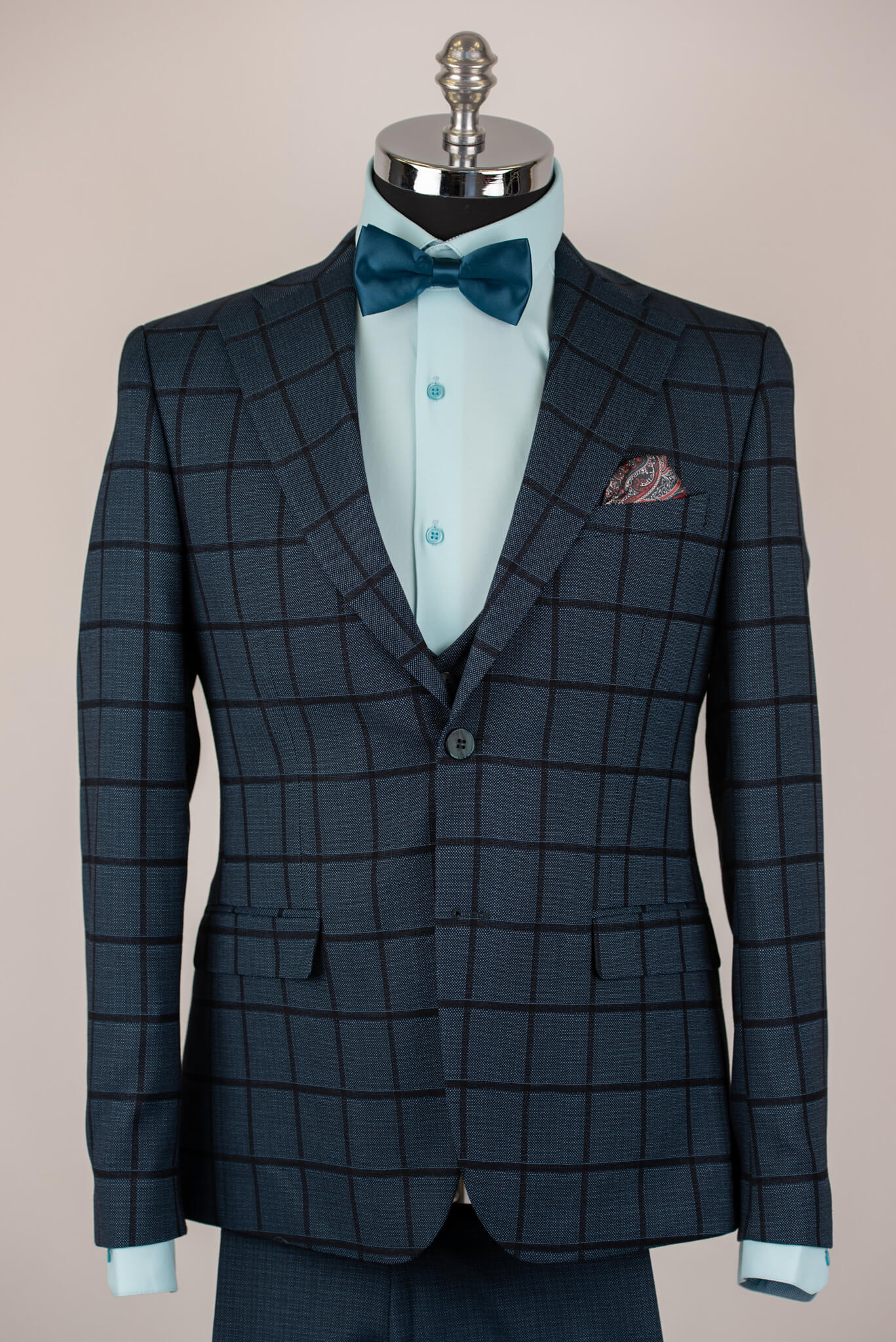Tumši tirkīza zils Quesste slim fit uzvalks ar vesti un rūtainu rakstu