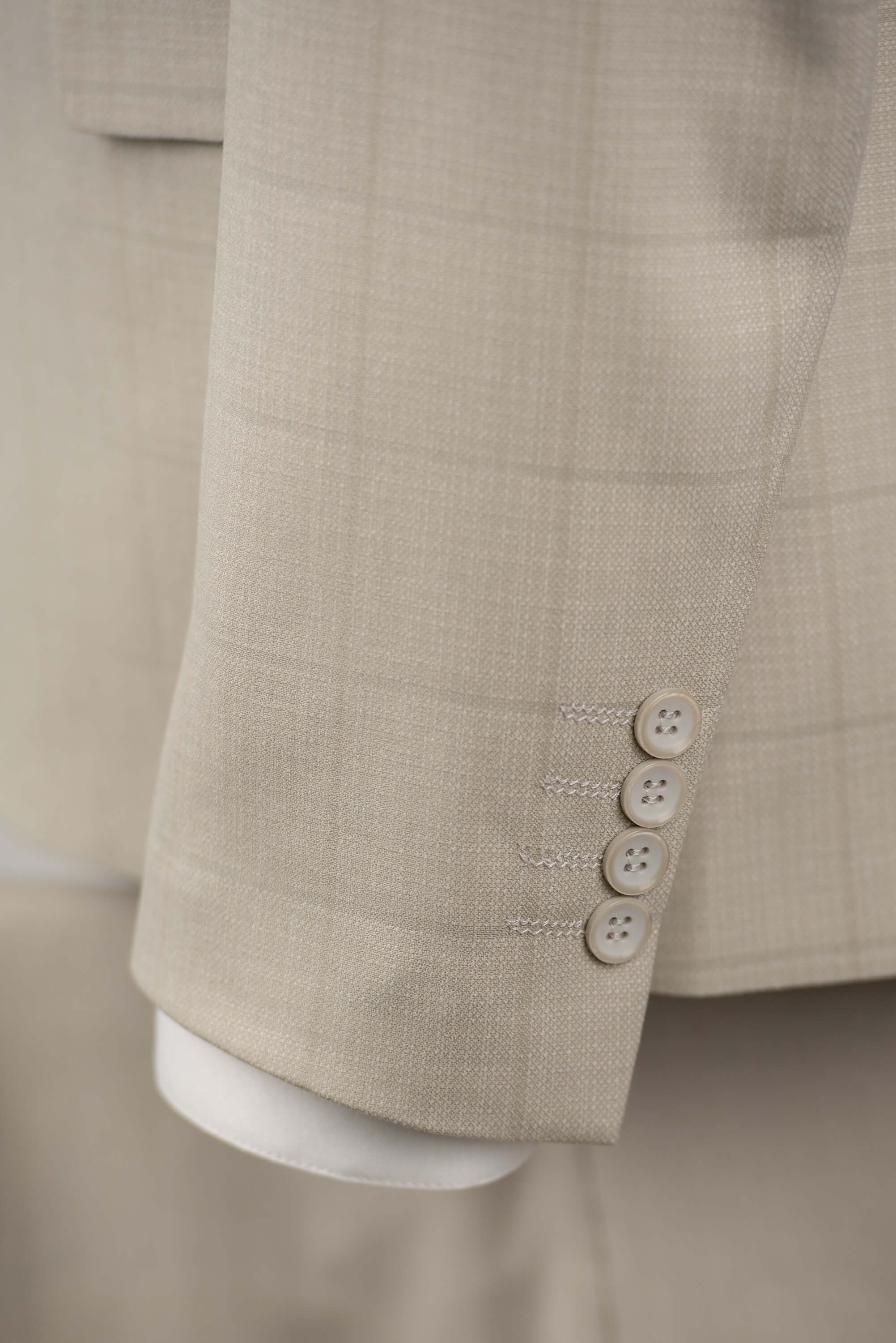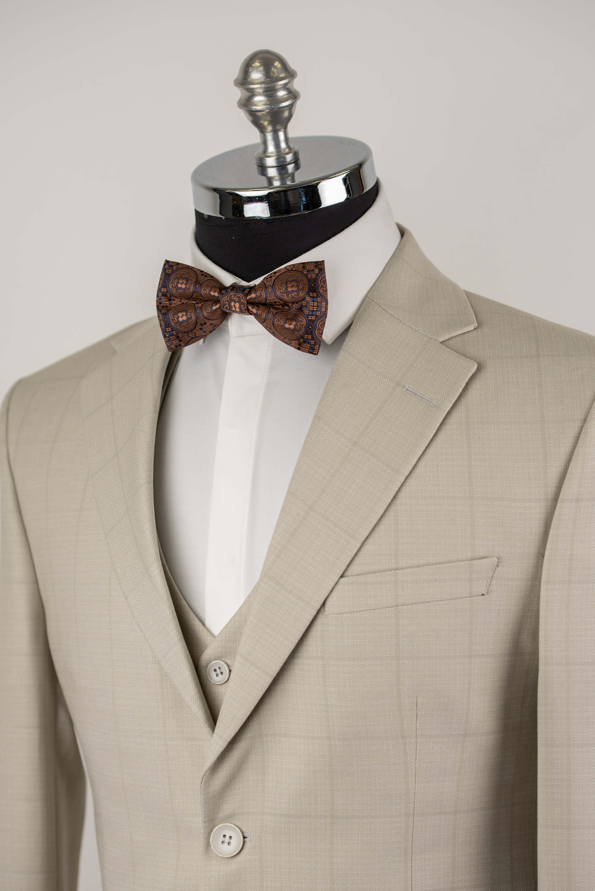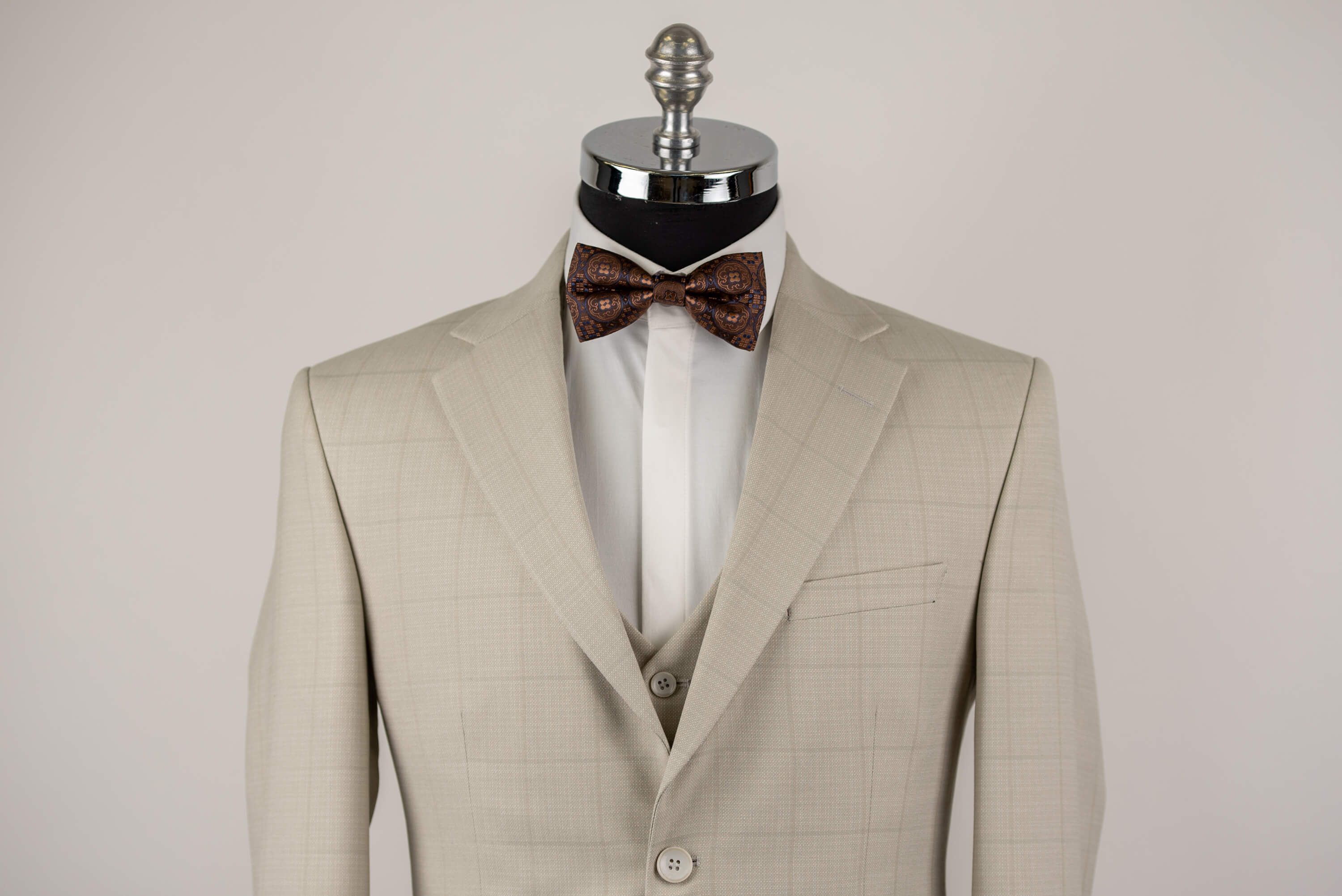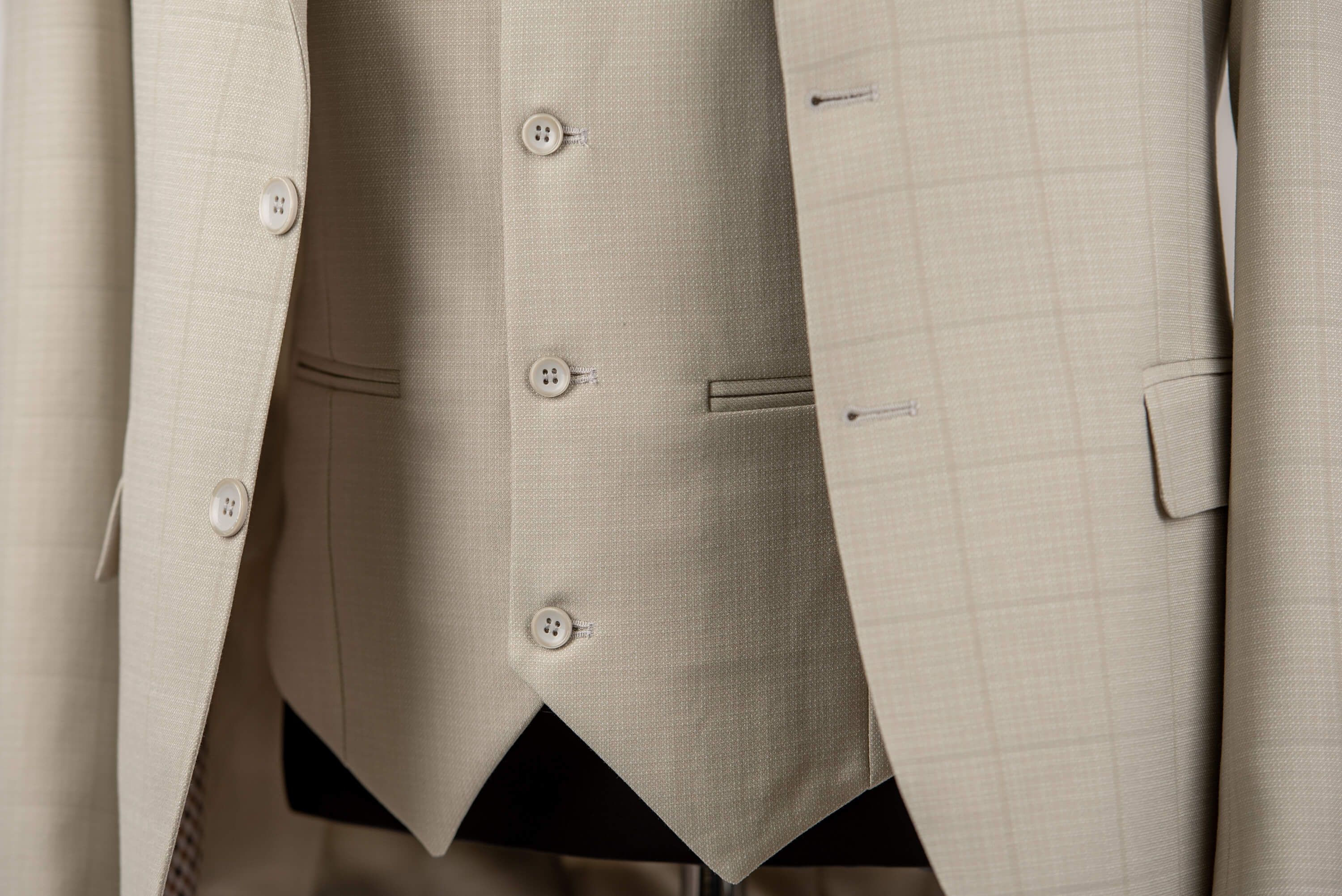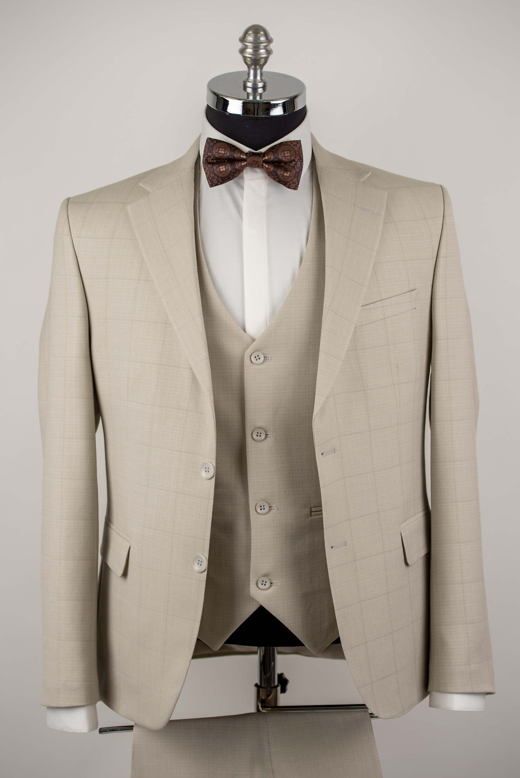 Gaiši bēšs Azzaro slim fit uzvalks ar vesti un rūtainu rakstu