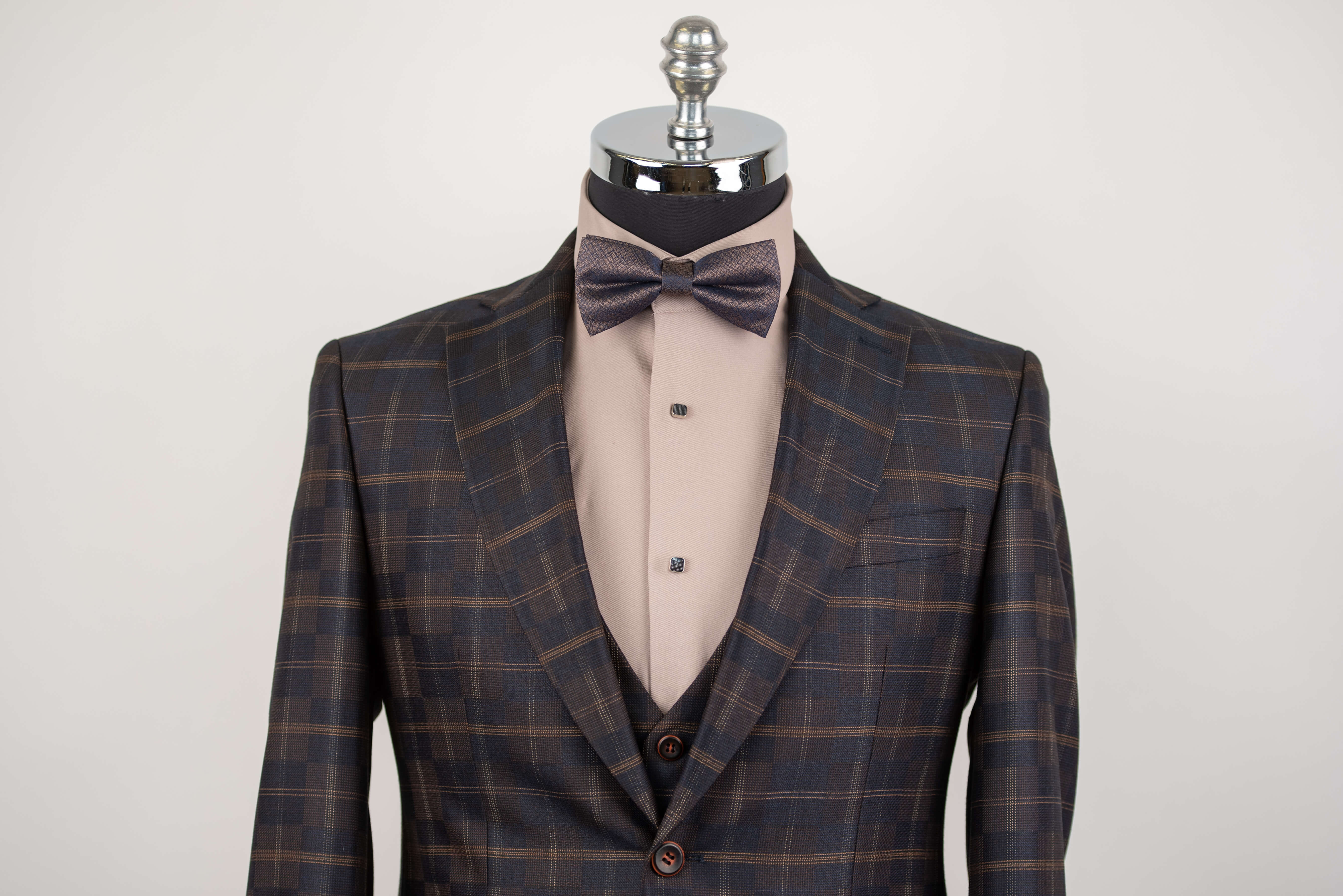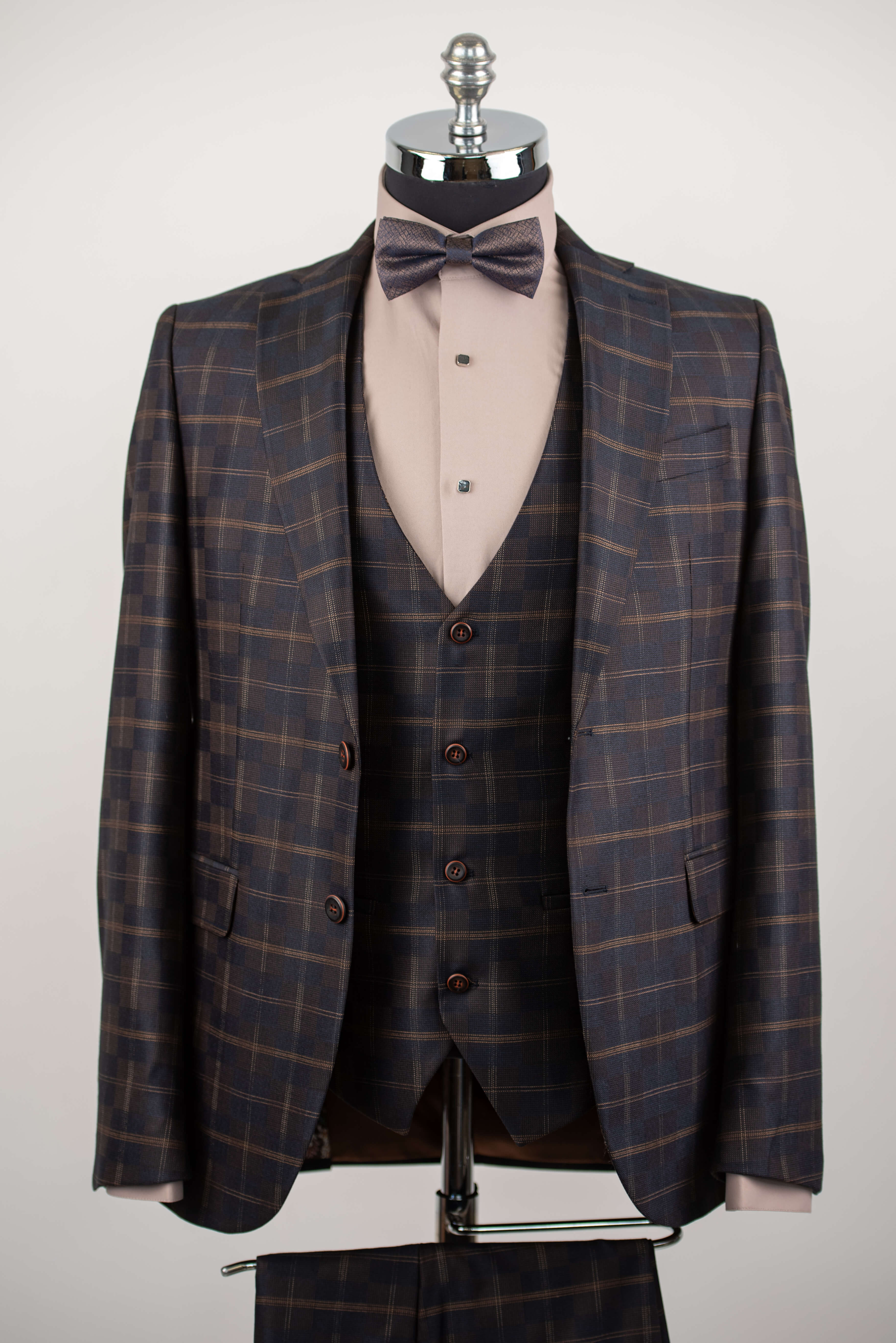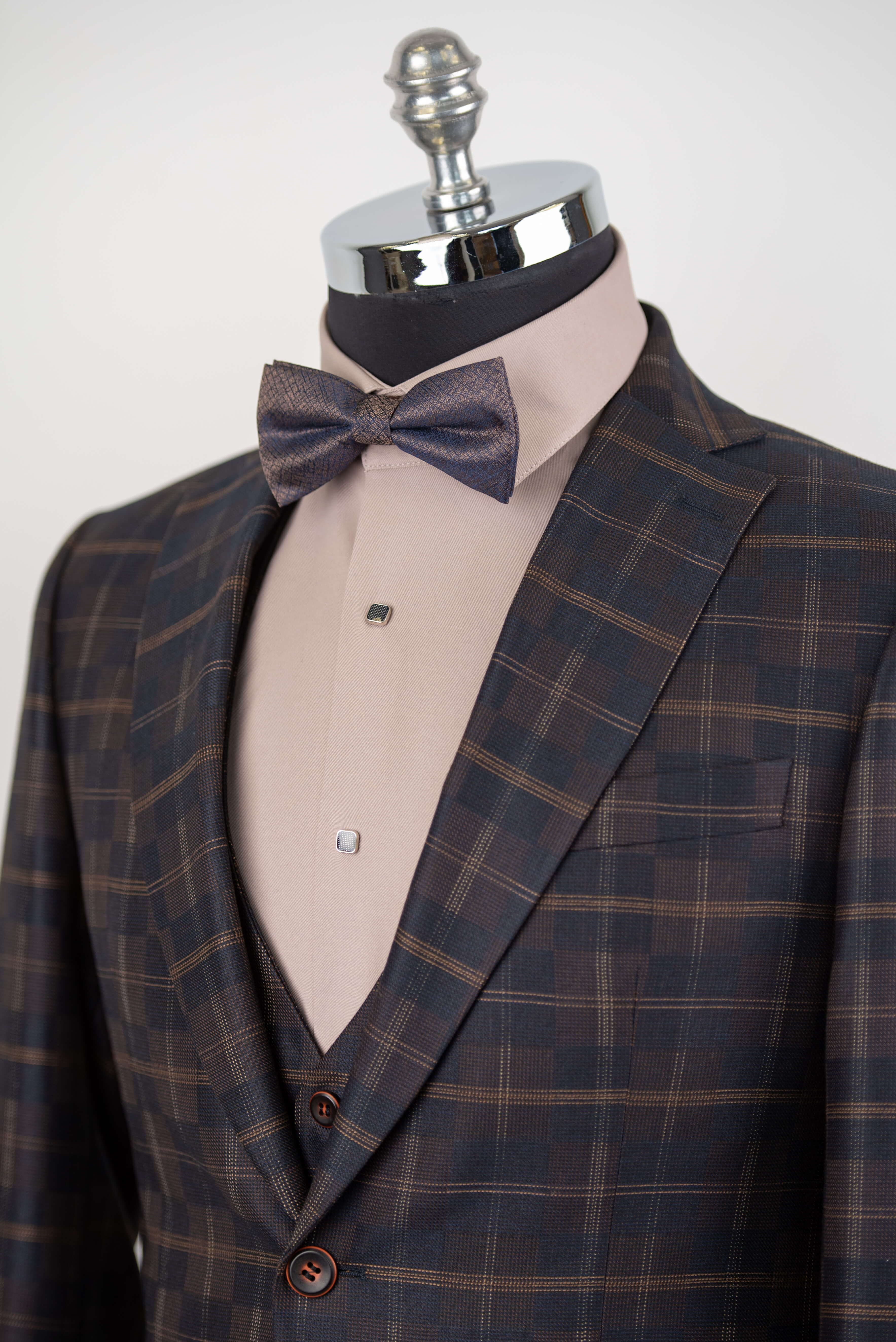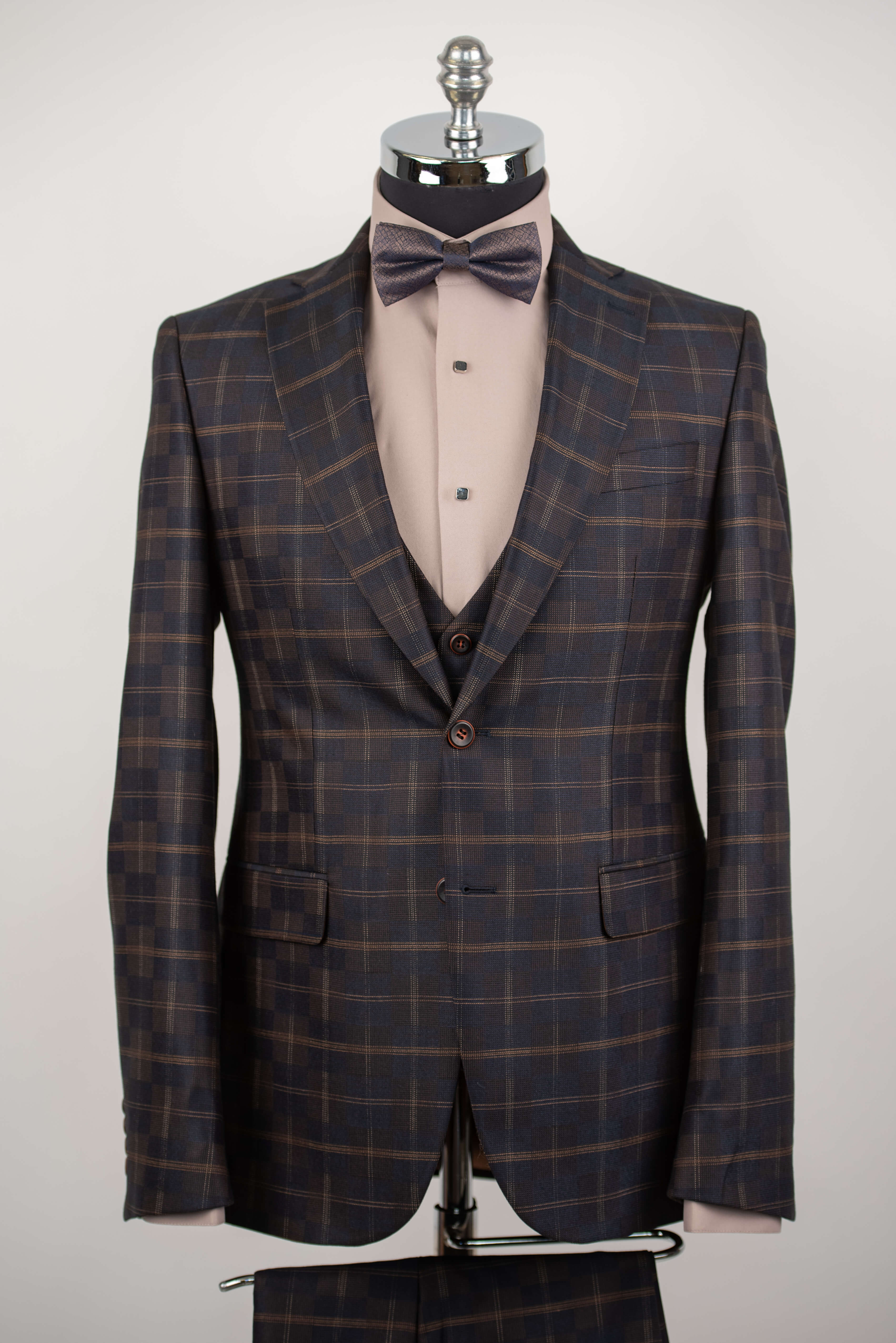 Tumši brūns Quesste pagarinātais uzvalks ar rūtainu rakstu un vesti