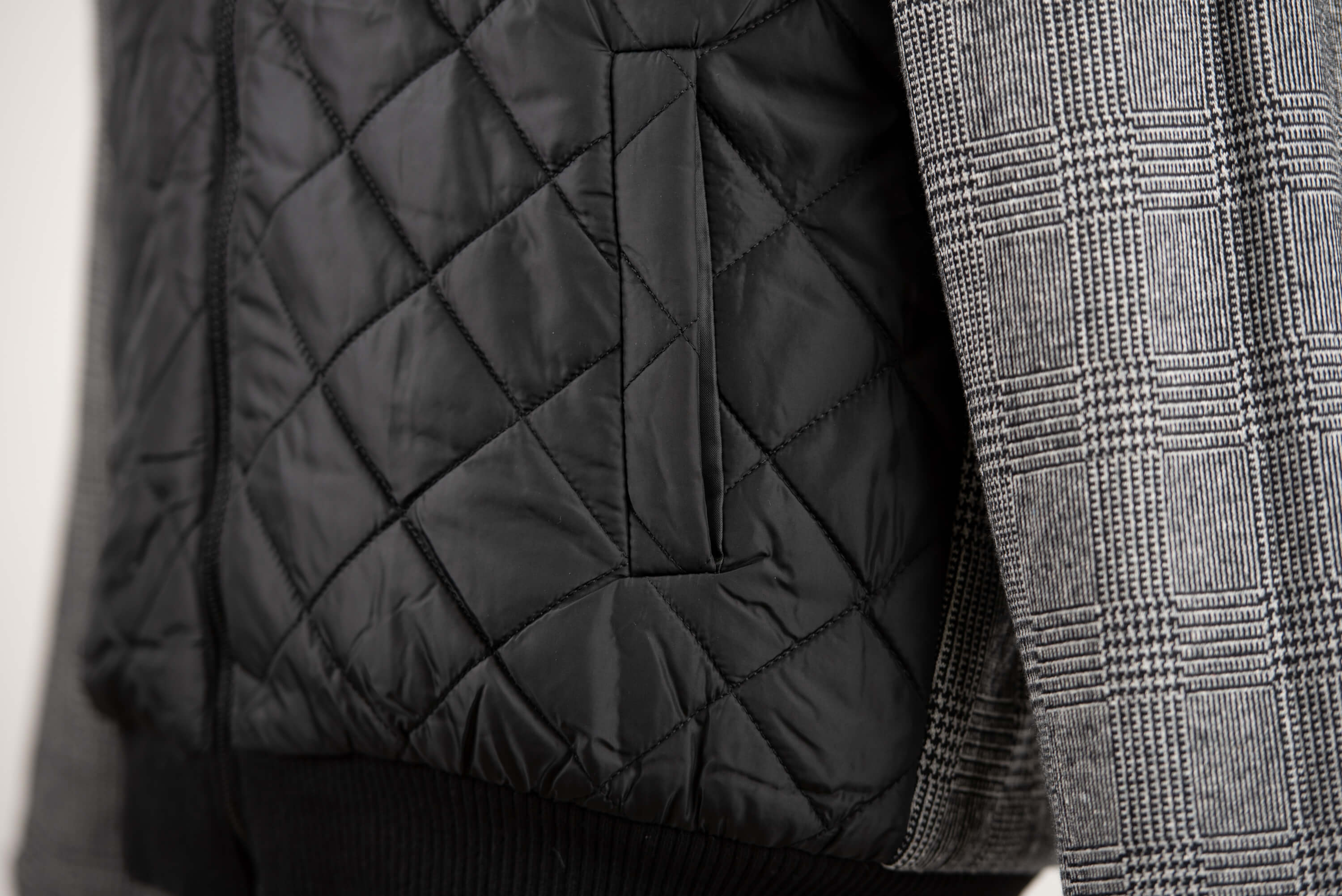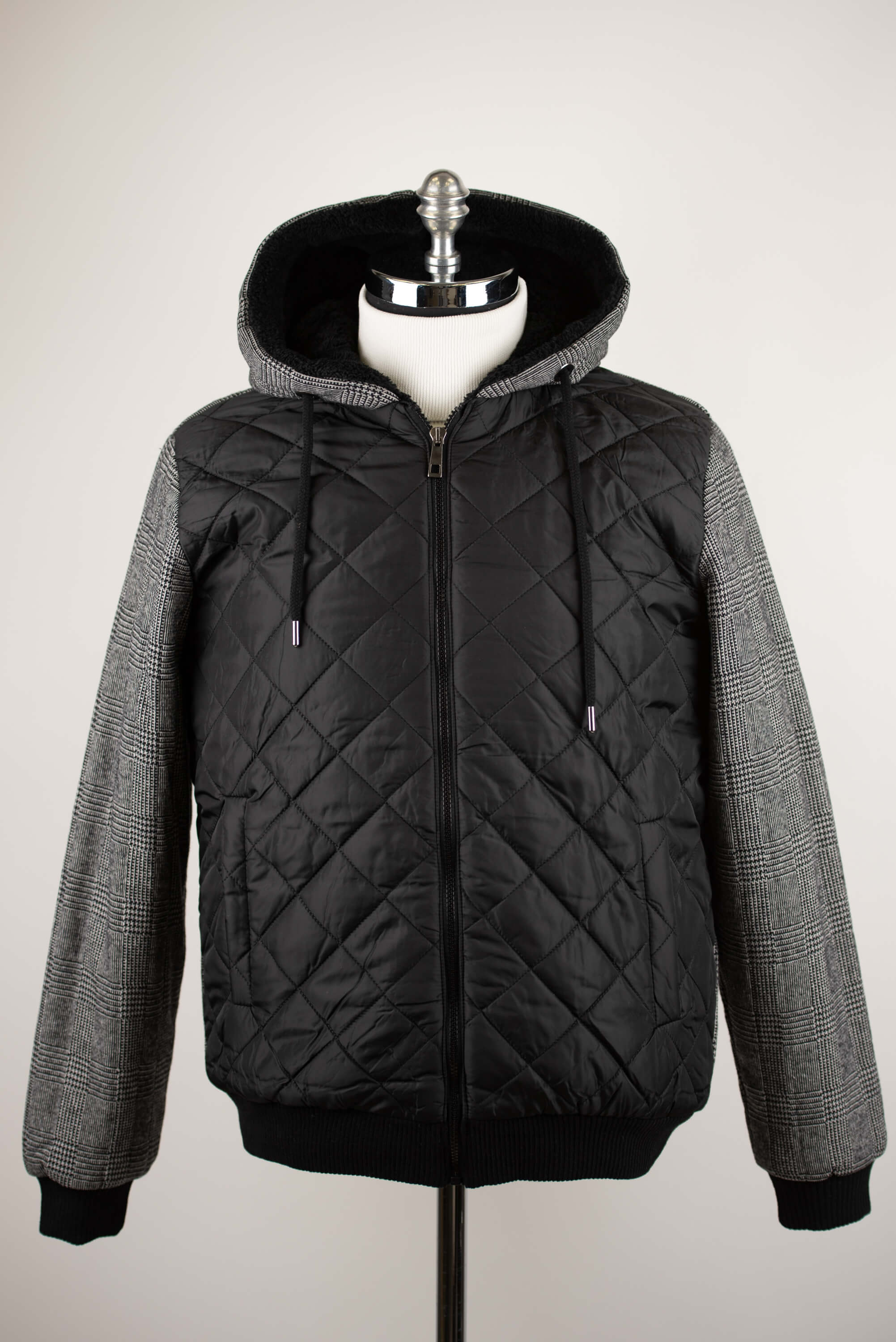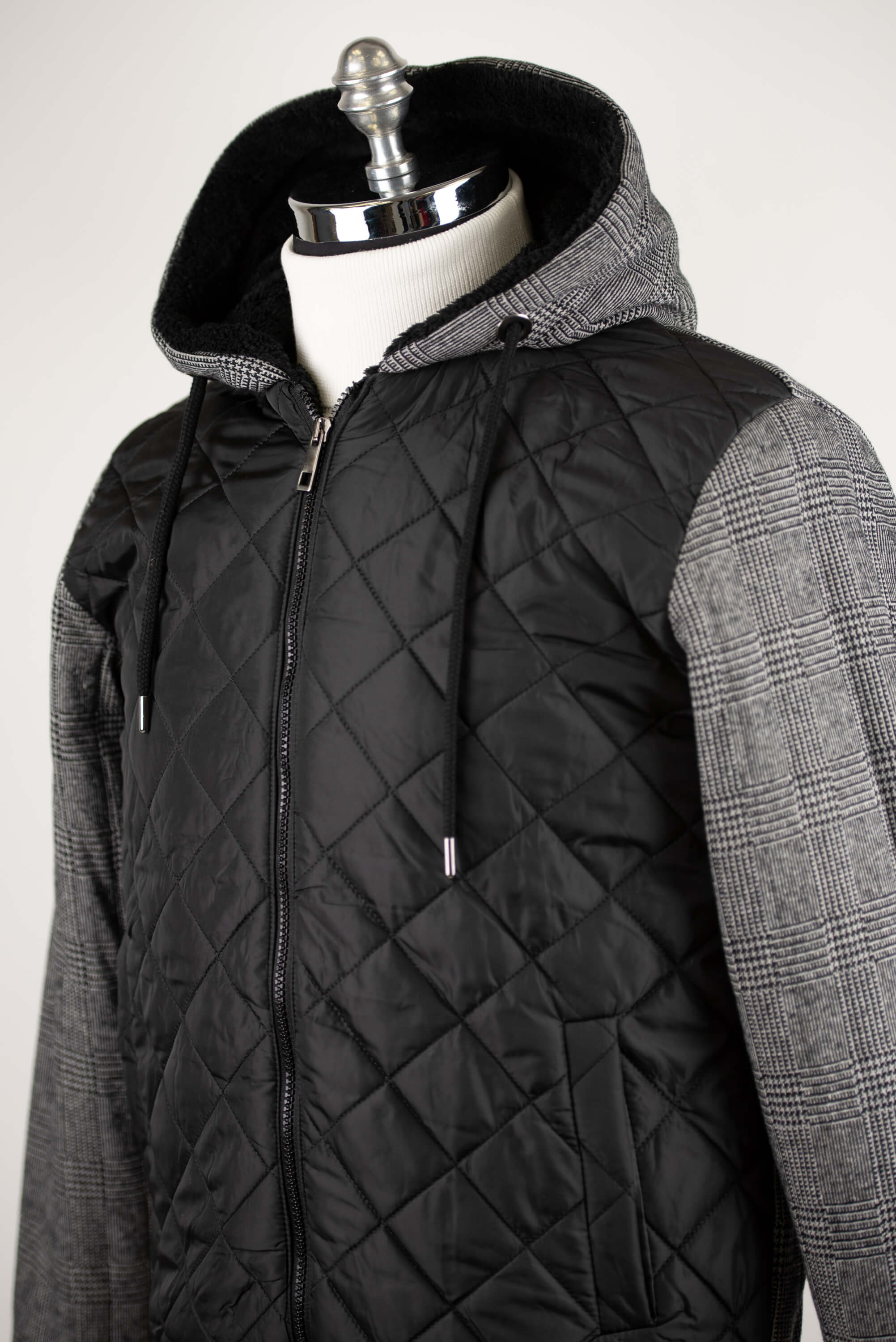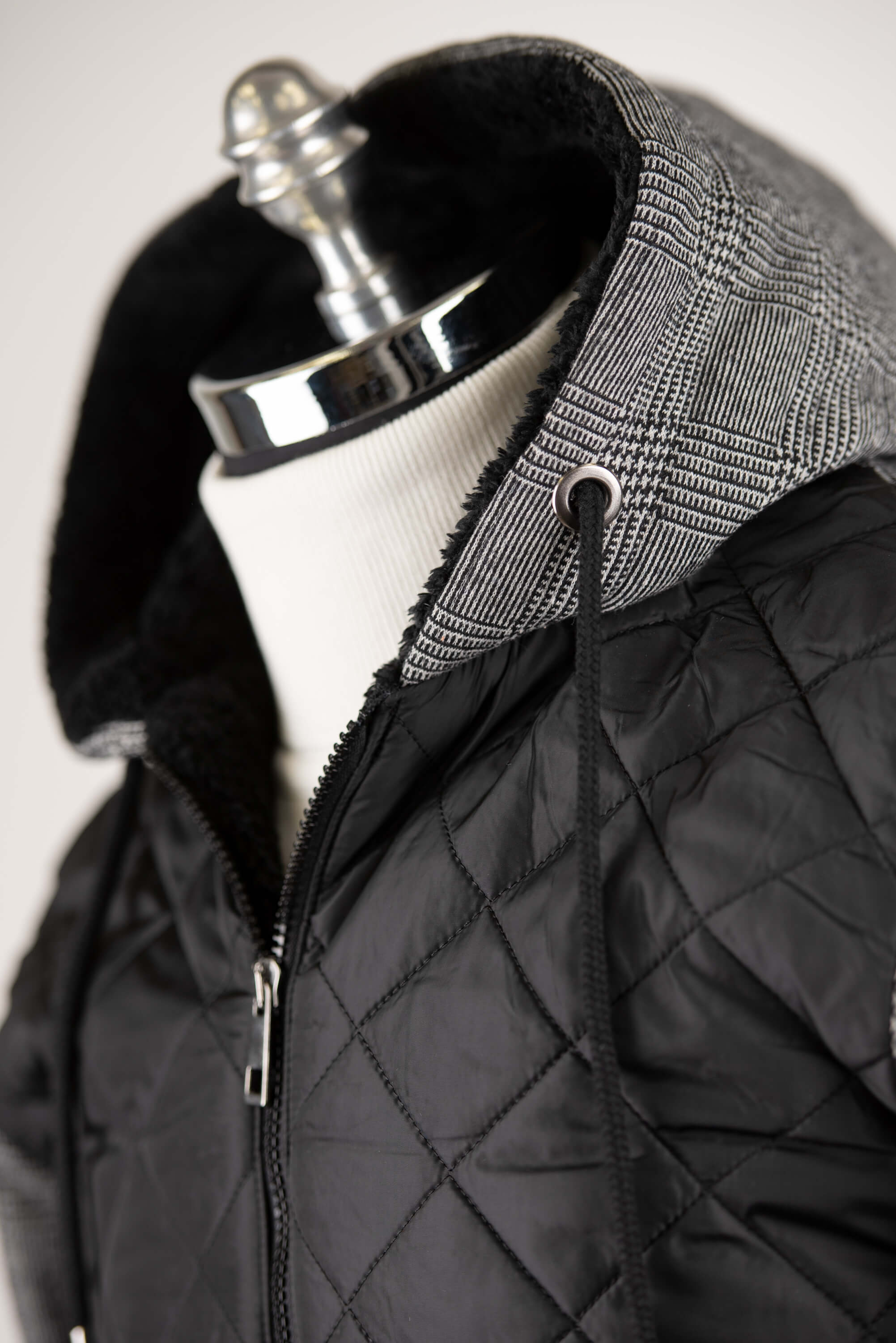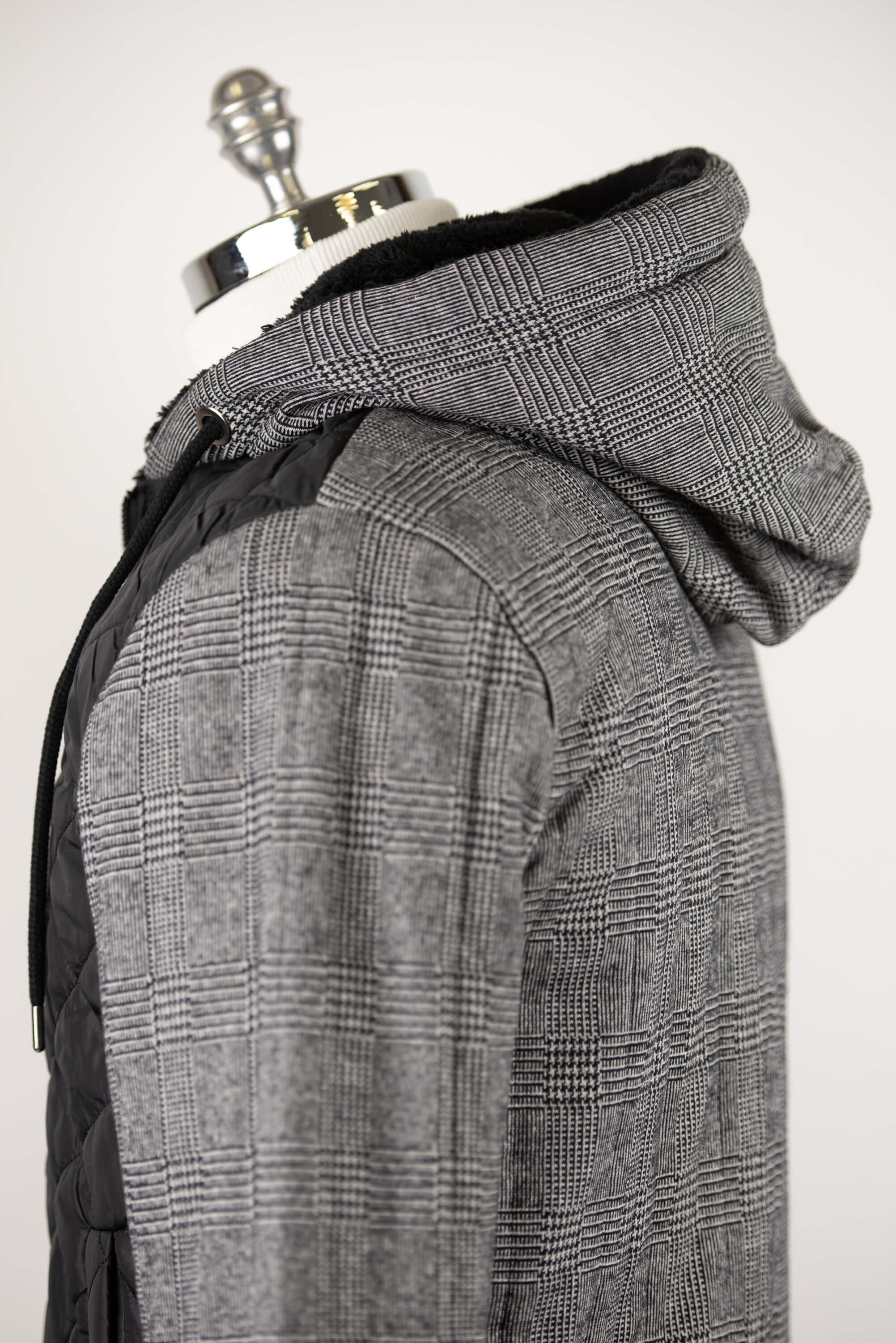 Melna siltā jaka ar kapuci un rūtainām piedurknēm