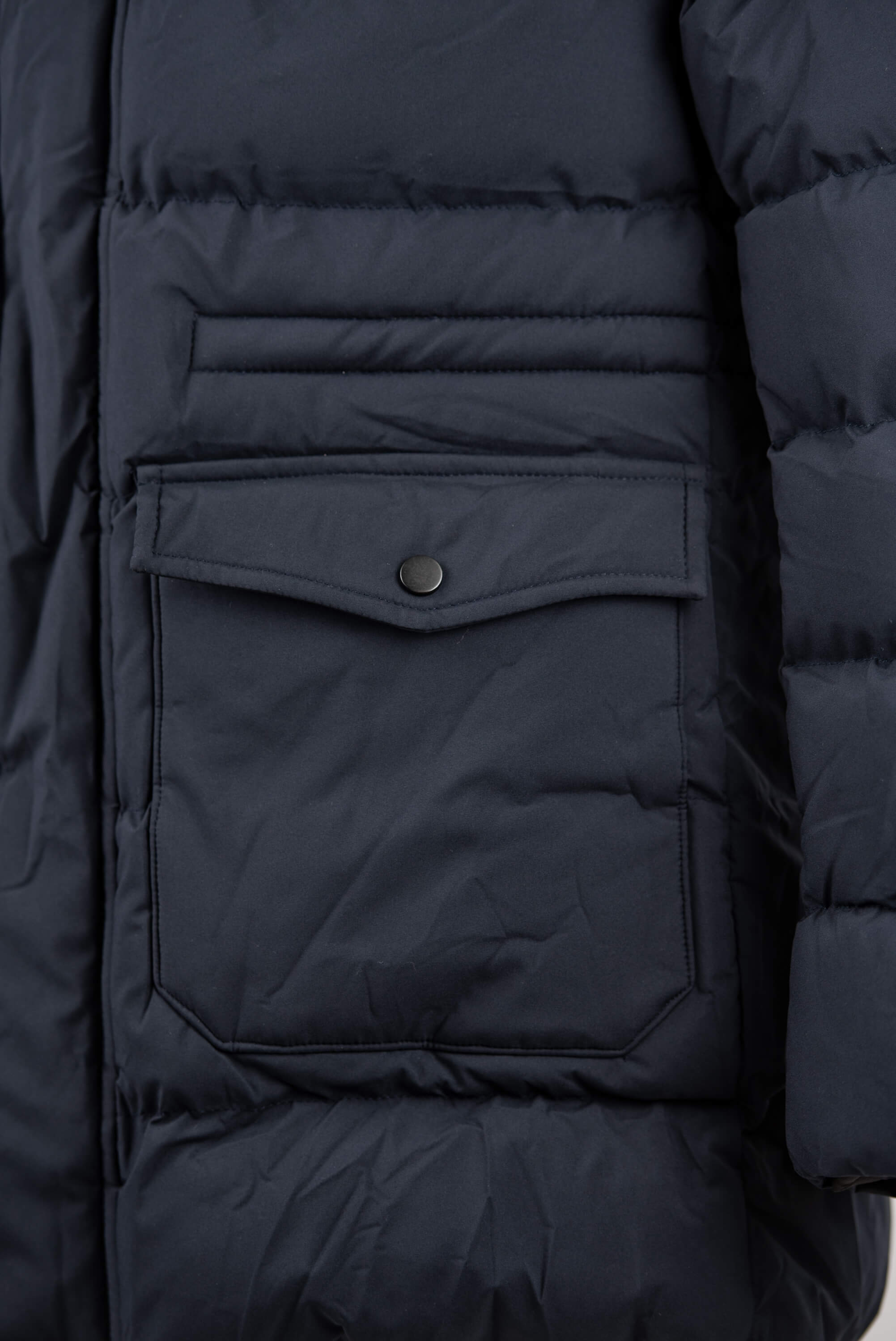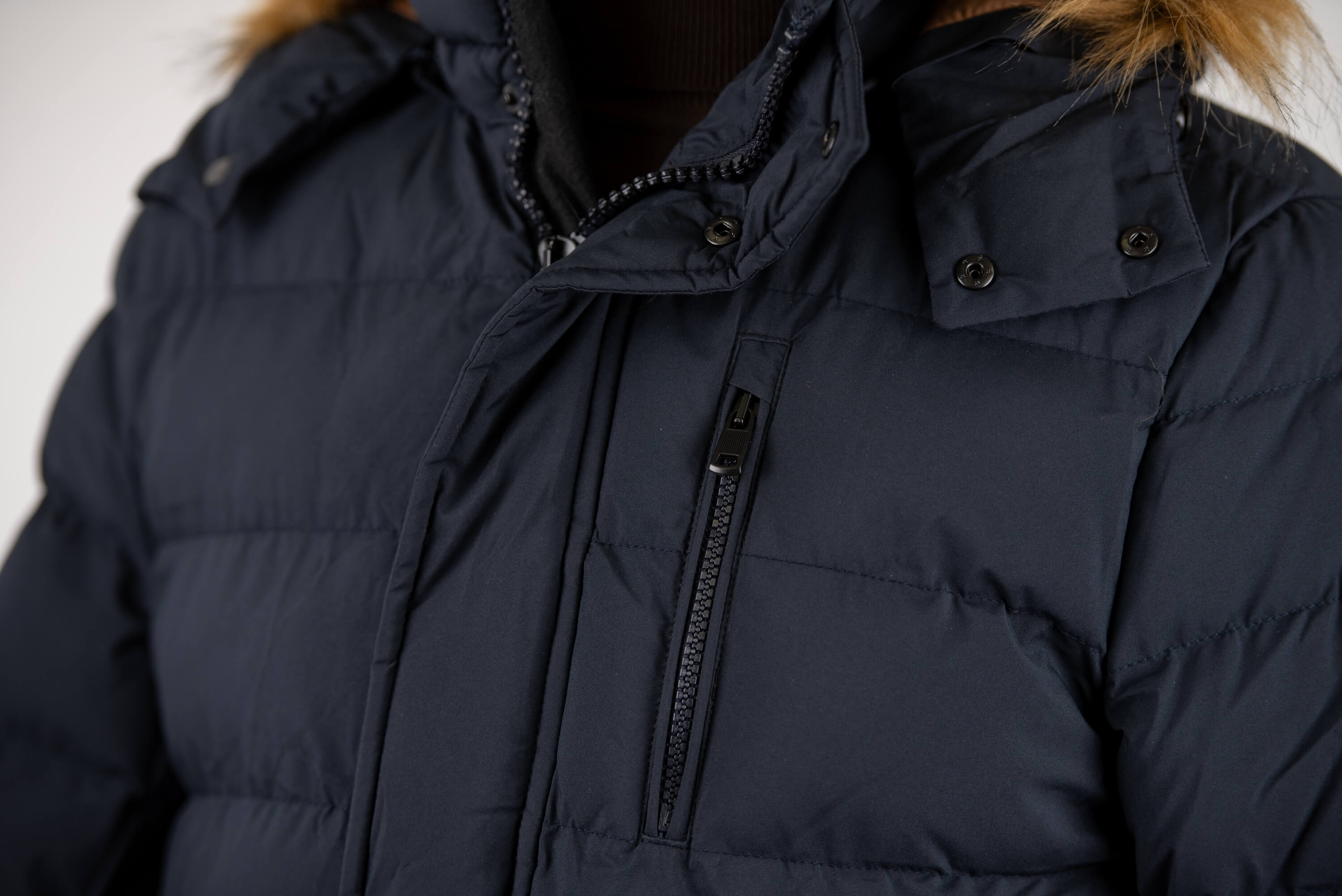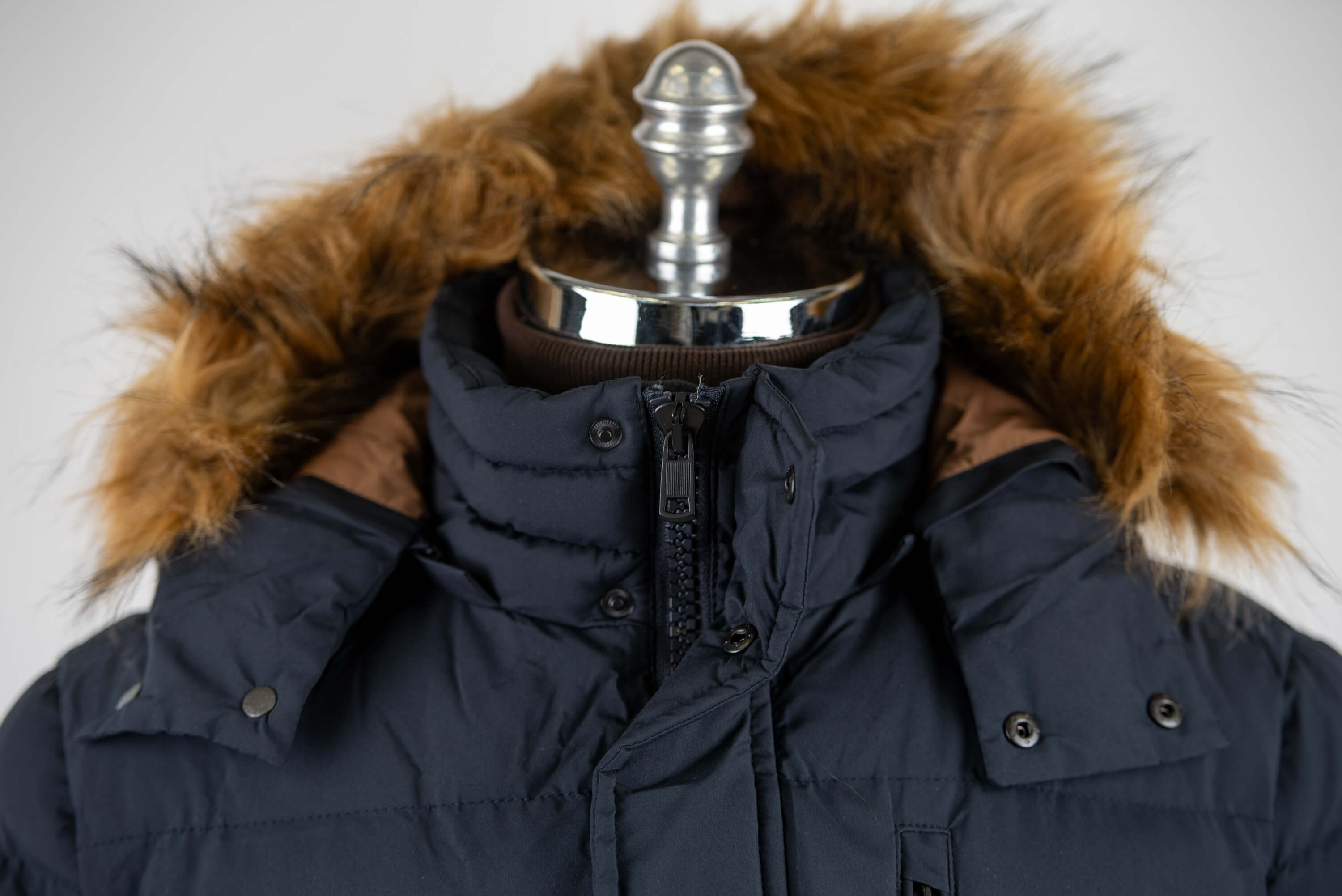 Tumši zila Montmen silta stepēta pusgarā jaka ar mākslīgās kažokādas kapuci